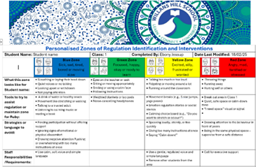 The green zone represents a state of optimal learning and engagement - students are calm, focused, and ready to learn and interact positively. When students find themselves in the yellow, blue, or red zones, they are supported to use personalised tools and strategies from their individual 'toolboxes' to regulate their emotions and return to the green zone. This consistent, school-wide language and approach empowers students to take ownership of their behaviour and supports a safe, inclusive, and emotionally responsive learning environment.